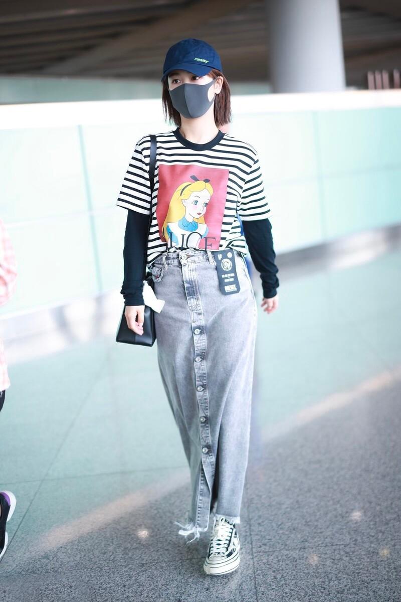 The black and white zebra pattern is a very popular element, and the princess print pattern also makes Yang Zi look like a little princess. Choose a long denim skirt with a distinctive style that makes you look like a Korean girl.