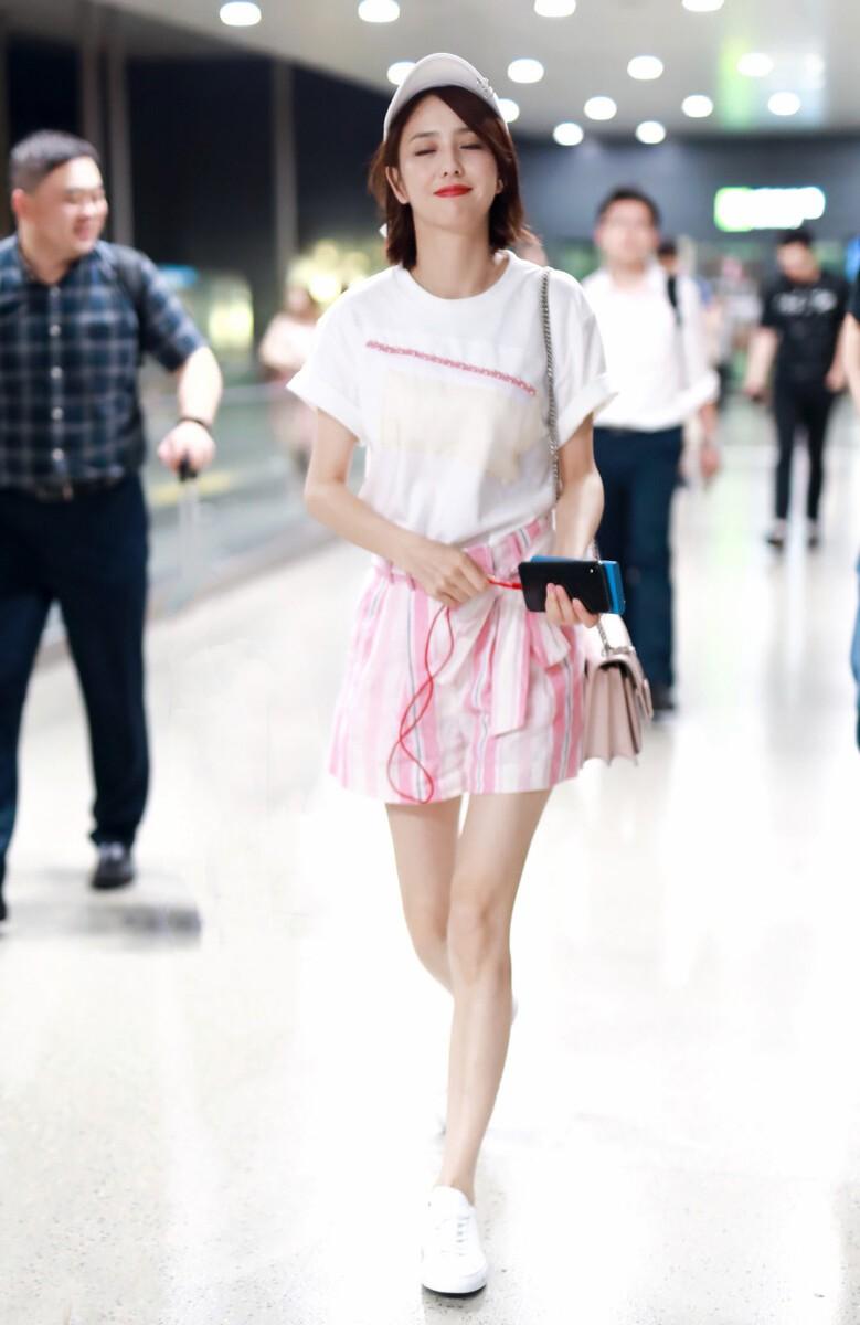 The striped shorts with pink as the main color are full of girlish charm, with a little white embedded in them, which not only adds gentleness and graceful charm, but also echoes the T-shirt on the upper body. The light figure and refreshing color scheme show a full sense of youth. This matching style makes Tong Liya look like a girl, and also shows her free and easy charm.