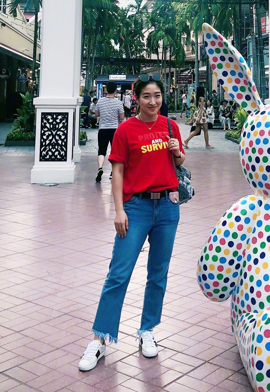 Big red T-shirts are enthusiastic and energetic, but it is difficult for ordinary people to control this color. Chinese athletes often choose China It has red short sleeves, so it looks very harmonious on Liu Shiwen. Paired with straight jeans, it shows her pure and gentle side.