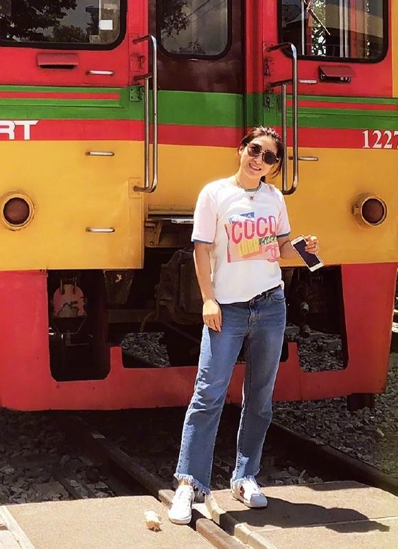 Tassel jeans paired with white flat shoes are light and comfortable to wear, giving a casual and girly feel. On the upper body, Liu Shiwen picked a colorful printed T-shirt. It is mainly white, gentle and elegant, and is embellished with a variety of colorful letters, adding hip-hop charm and making the match more elegant.Western style. Wearing sunglasses adds a bit more holiday style.