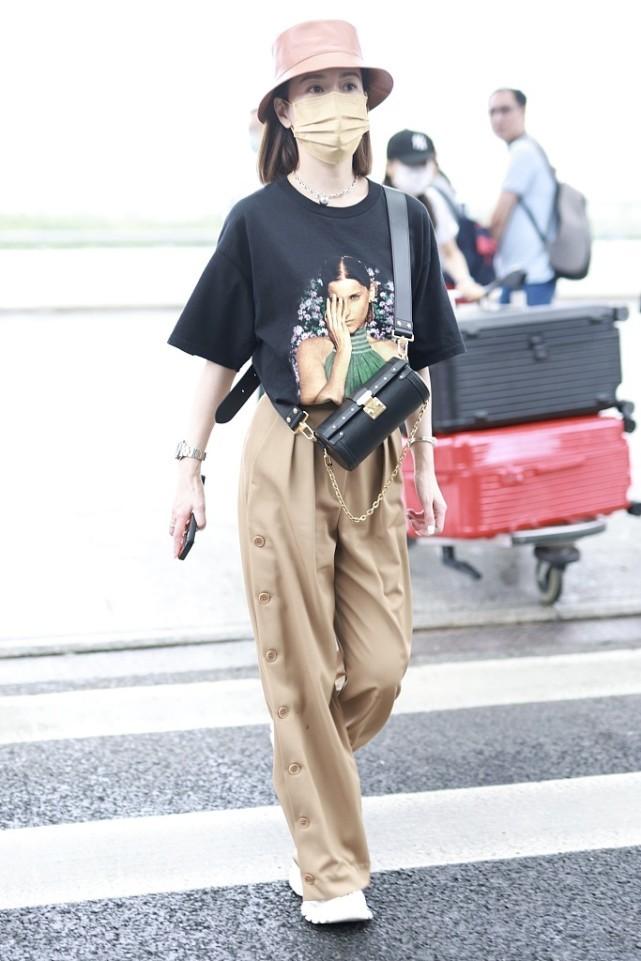 The high-waisted combination of a wide T-shirt and wide-leg pants is quite common among young people. The loose feel of the shape can greatly enhance the casual temperament. It is simple and elegant without losing the street style. trend. On this basis, Charmaine Sheh will also add accessories to add a sense of sophistication. The unique cylindrical cross-body bag greatly enhances the personality of the outfit. With the light color scheme of dark top and light bottom, it is trendy without losing youthful vitality.
