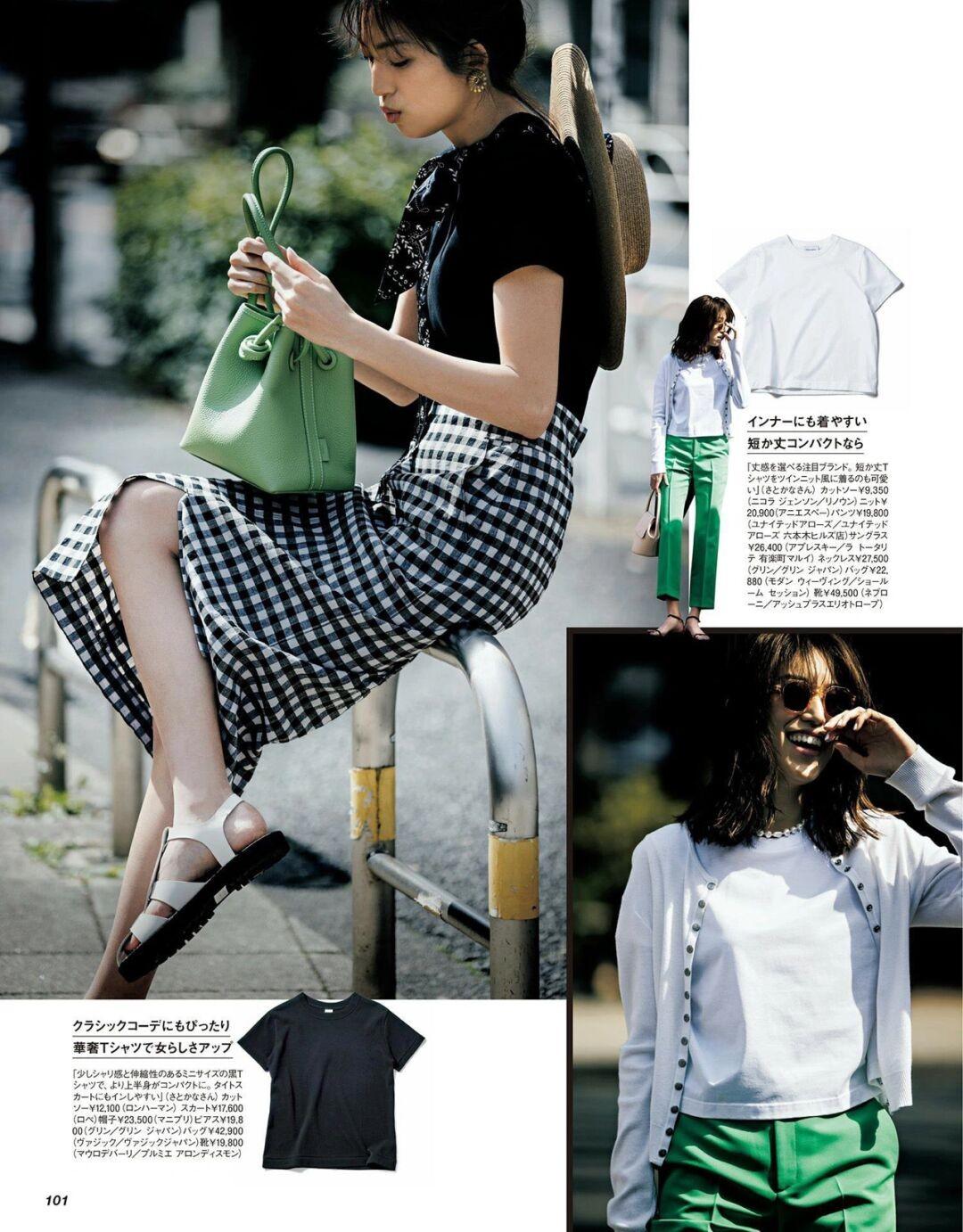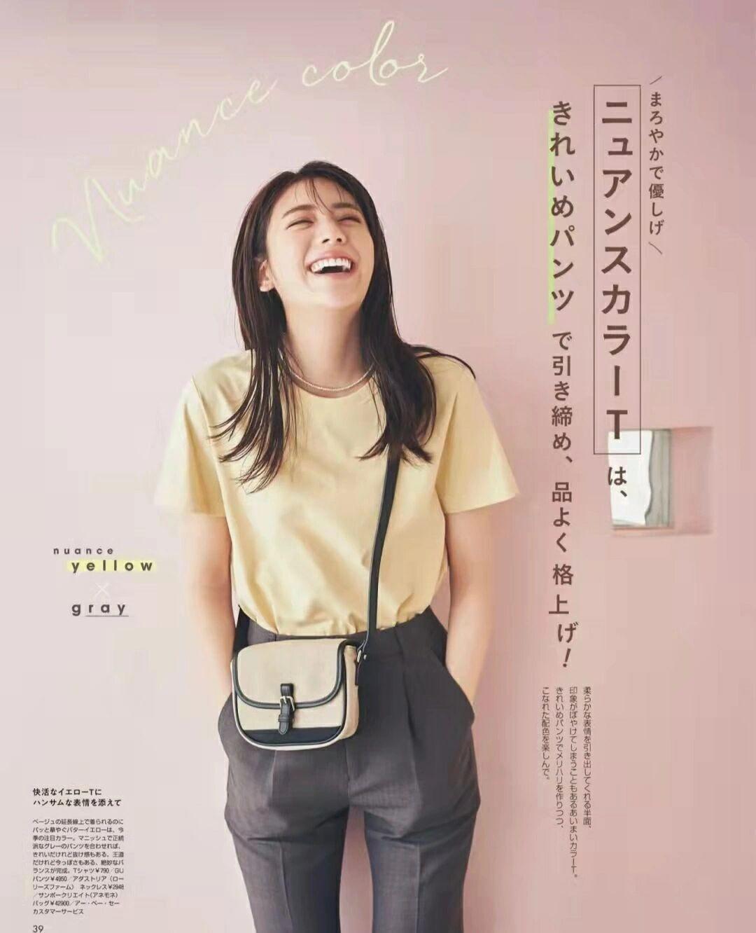 A light yellow T-shirt like this is used with a plaid skirt. It does not look plain but also gives people a fresh visual sense. The handbag is very suitable for traveling, it is niche and has a sense of age reduction.