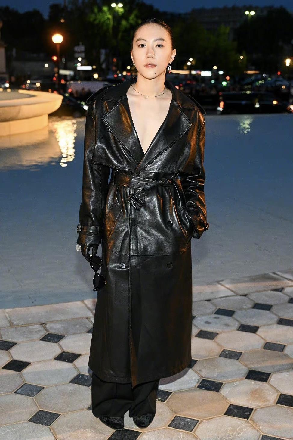 The leather windbreaker is really too personal. With the fashionable leather windbreaker, you can effortlessly reflect the sense of high-end. Dou Jingtong mastered this fashionable black combination. The black leather windbreaker combined with black wide-leg pants is casual and easy. , super fashionable.