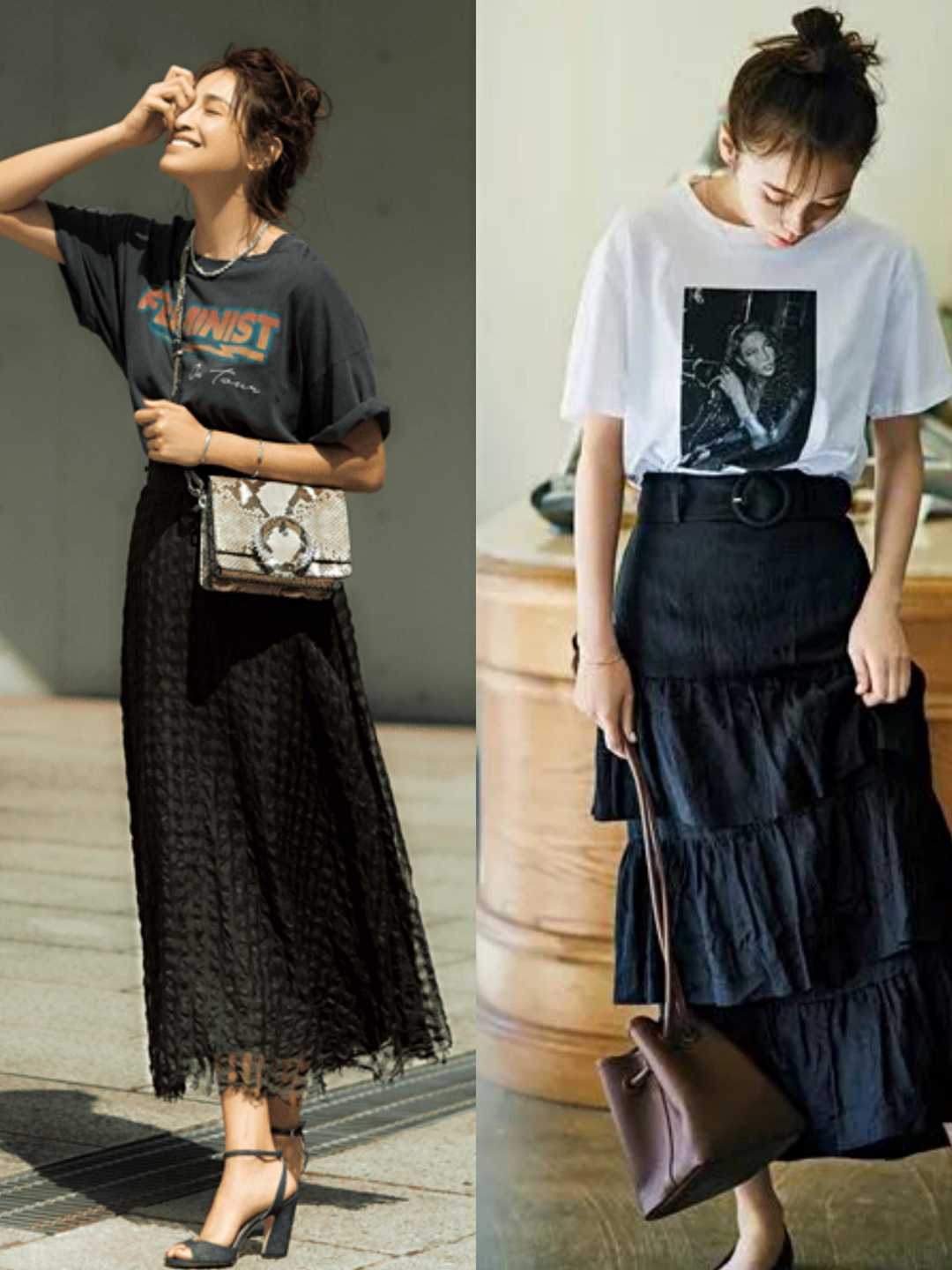 The little white dress is very classic, and the little black dress is an item that will not go out of style easily. This kind of little black dress can be worn in any season and at any age. , and the styles displayed after the little black skirt is paired with a T-shirt are also diverse. For example, the combination of the black long skirts below, combined with a simple T-shirt, is lazy and fashionable, both casual and feminine.