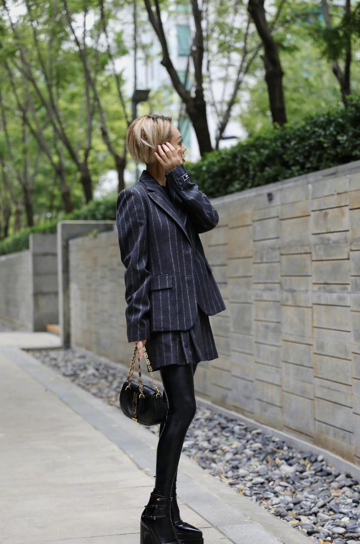 Singles such as suits can be used to match most of the time, and basically not Stepping on thunder is easy to control. Ning Jing chose a striped suit for himself and put it on with a fashionable striped suit.Short skirt, and then combined with leather pants, such a sexy outfit reflects her personal charm. It looks very fashionable to me, and then paired with thick-soled high heels, it is also very fashionable and elegant.