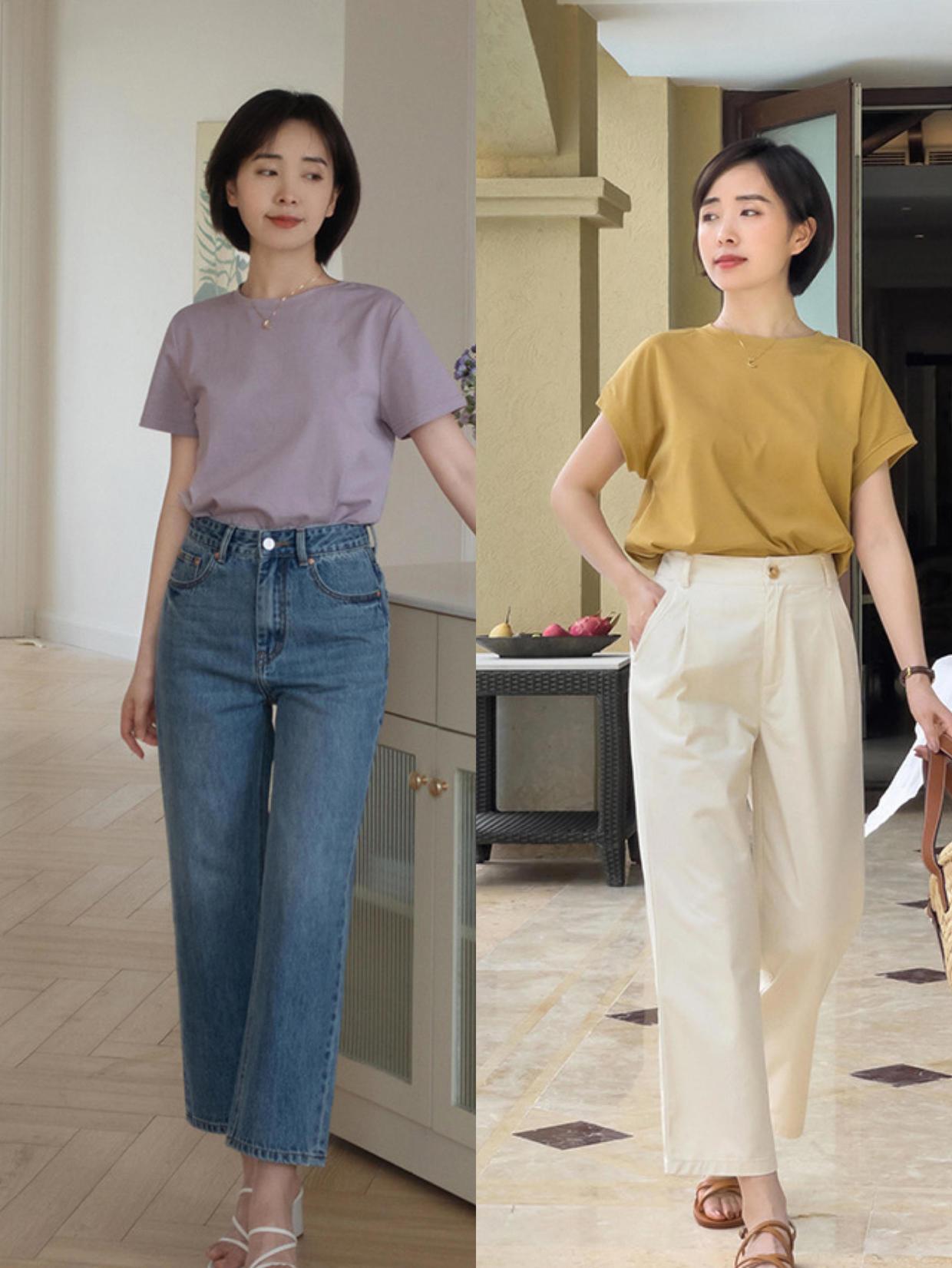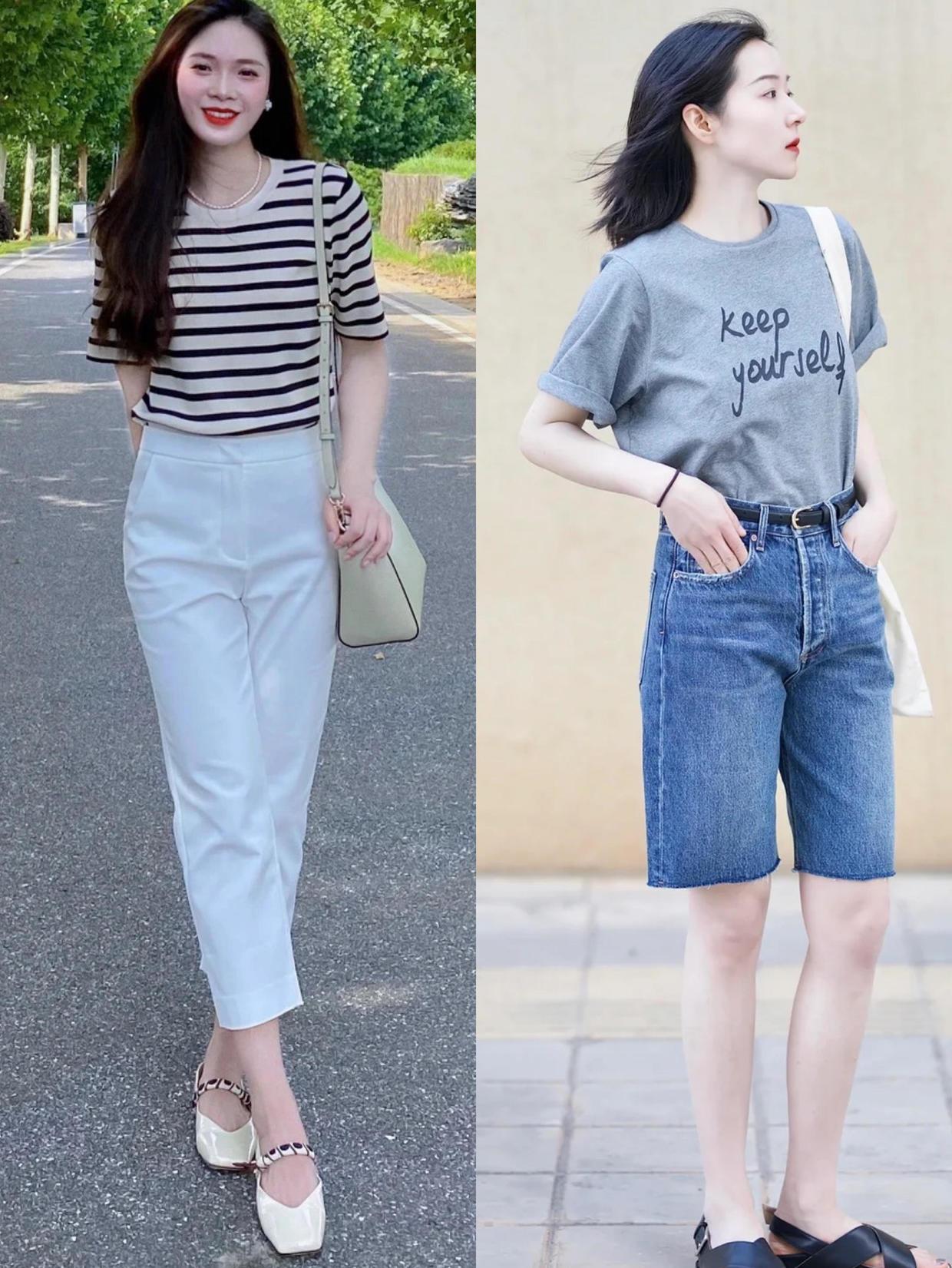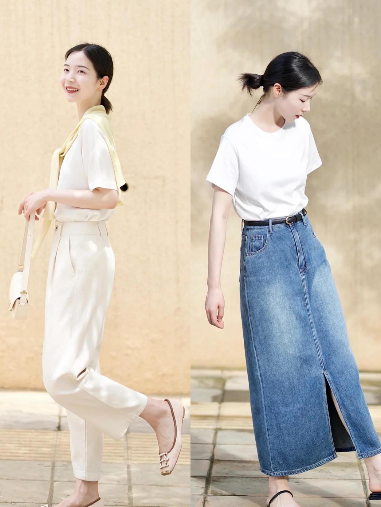Wide-leg pants paired with a T-shirt are simple and fashionable. Loose wide-leg pants or straight-leg pants like these are also very suitable for pear-shaped figures. They are quite refreshing when paired with a T-shirt. In addition, you can pair them with sandals and High heels can make your legs look slimmer and longer, giving you a more sophisticated look.