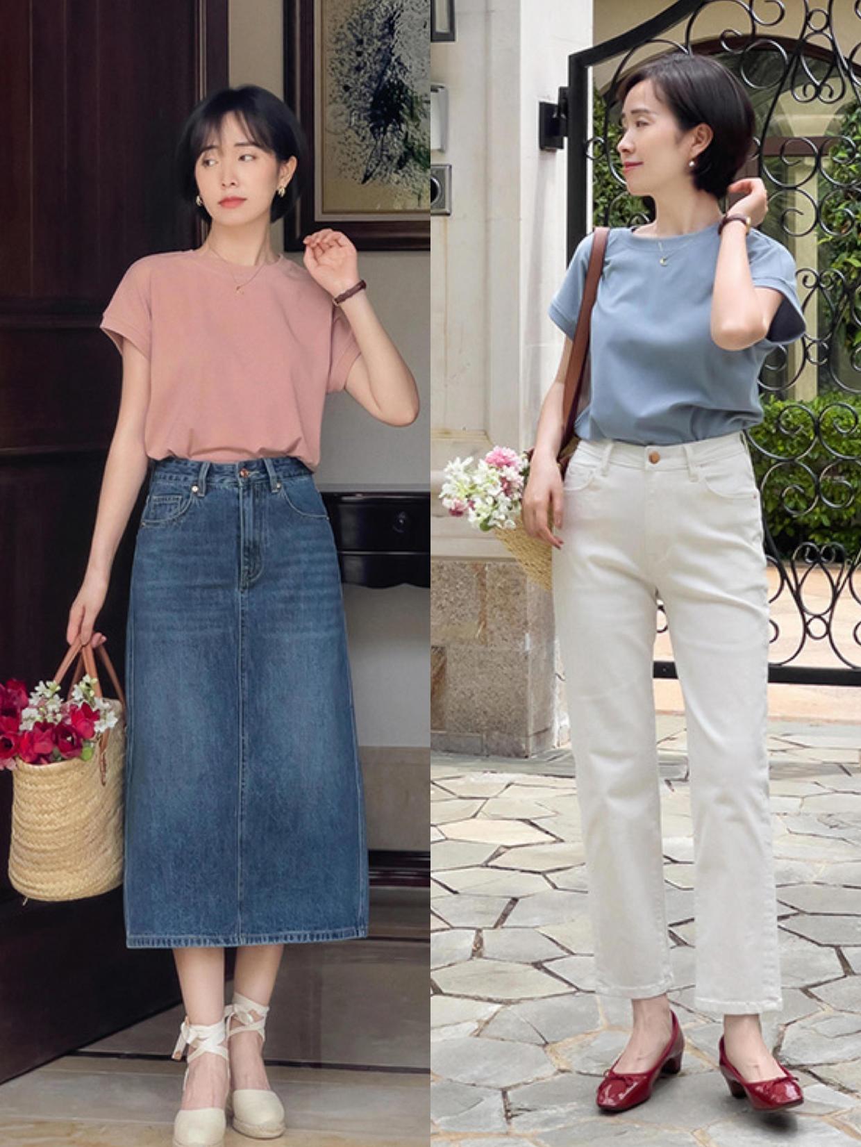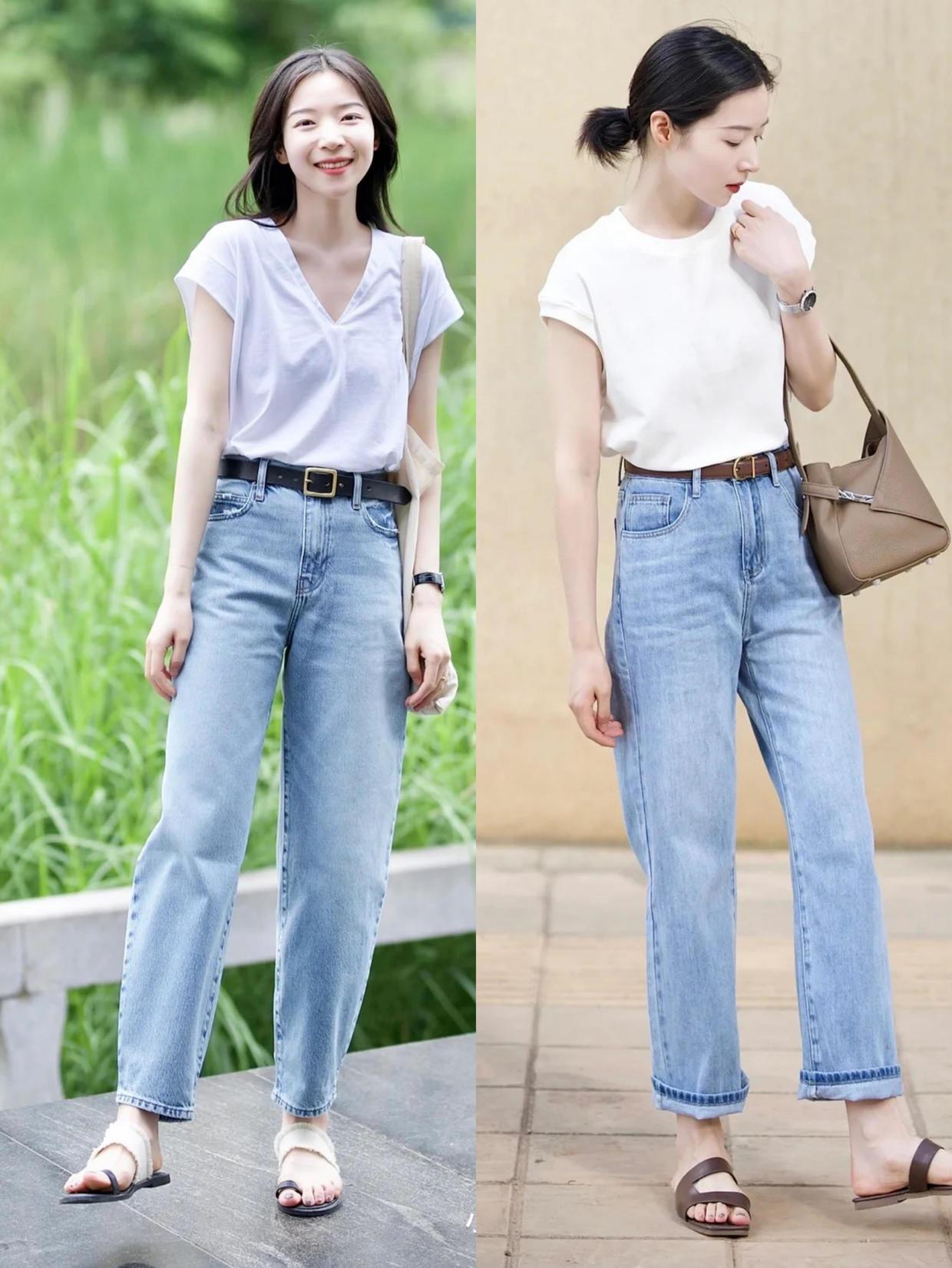 The combination of T-shirts and jeans is very classic. Girls and sisters can directly consider this combination every day. It is simple and fashionable. For example, these sisters can pair an ordinary solid-color T-shirt with high-waisted denim wide-leg pants. It embodies long legs and looks quite fashionable. The way it is tucked into the waistband of trousers can also modify our waist.