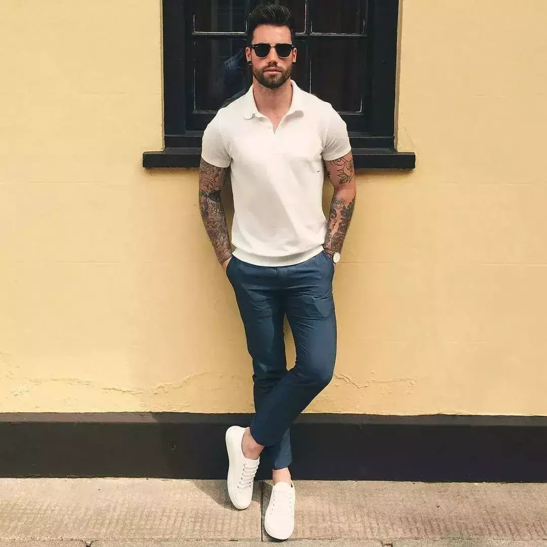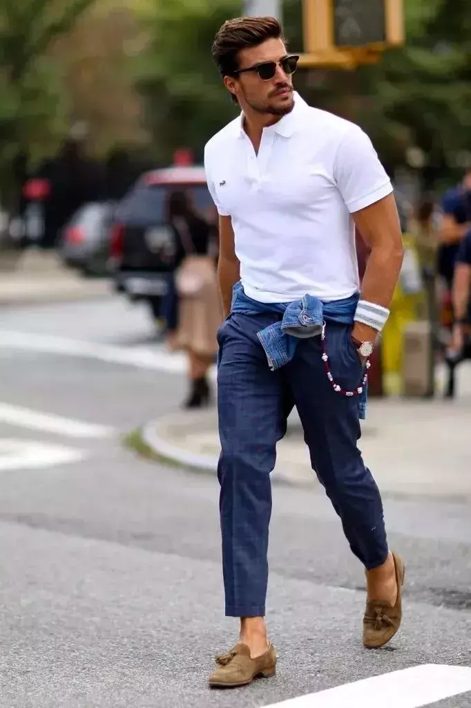 Polo in plain color is the safest, and the basic style can be matched with anything. Dark or white colors are also very versatile.