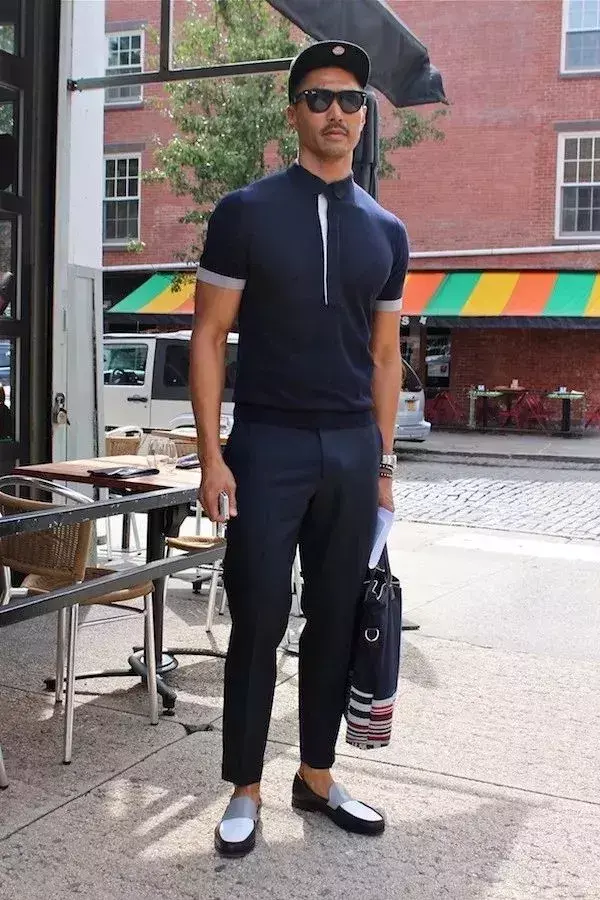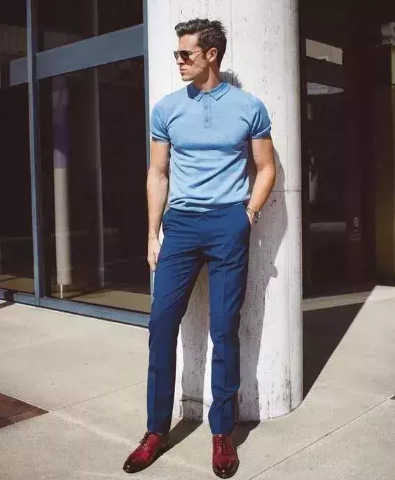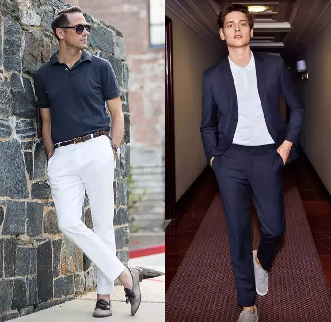 T-Shirt is too casual when paired with a blazer; a shirt is too formal when paired with a blazer;Polo shirts and blazers are an in-between option. So when attending some semi-formal events or parties in summer, Polo shirts can actually replace shirts and T-shirts. As long as you pair it with a thin blazer of the same color, the effect will be more integrated. Pair it with suit pants and leather shoes to show off your gentlemanly look, or pair it with sneakers to show off your cool look.