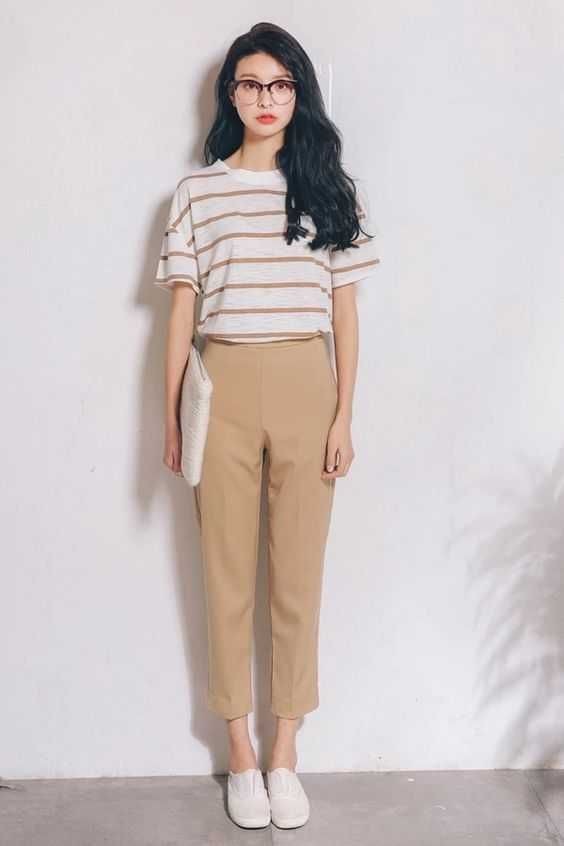 This kind of apricot-colored trousers is more casual and the color is not formal enough, so it is often used as casual fashion. Pair it with a striped T-shirt, which is especially suitable for students. It has a bookish and literary feel.