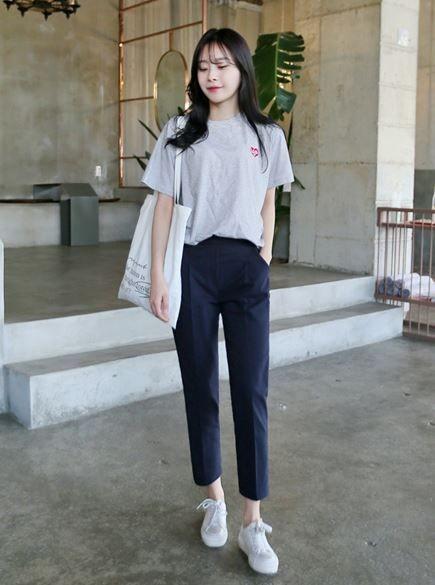 The one size smaller light gray T-shirt, whether it is a slightly loose style or color, is very slim and lightweight, looks pure and youthful, and matches the black nines Separate trousers are natural and have a little girl look, so they look good when going shopping and are not cumbersome.