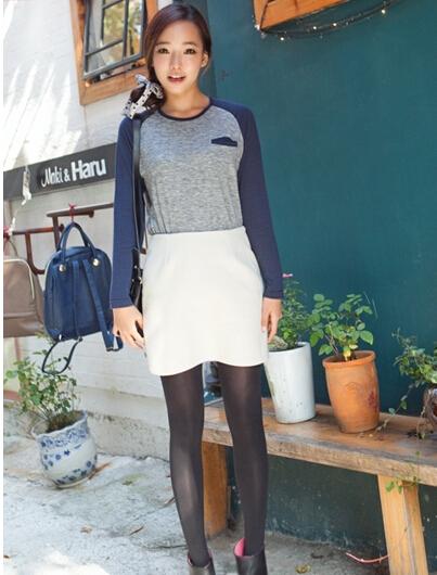 Contrasting color long-sleeved T-shirts are common As for the autumn T-shirt style, the eye-catching gray is paired with blue. The fashionable and versatile colors still have good temperament. The white hip skirt is paired with black short boots, which will make girls look longer and have a nine-headed look. Where is the body!