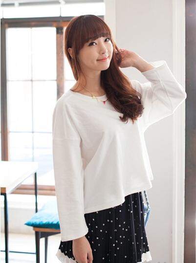The bat-style long-sleeved T-shirt is The first choice for fat girls in autumn is the creamy white top, which is eye-catching and elegant without losing temperament. The short design is fashionable and beautiful, and the black polka-dot high-waisted skirt makes the waistline appear taller!
