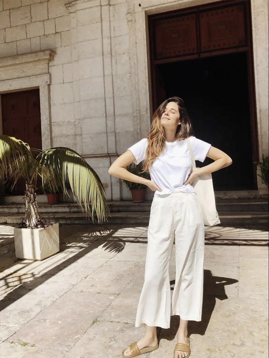 The last situation is very nice. The pants have a wide-leg + slightly flared design. The hem is also stuffed into the pants and then matched with A pair of slippers that can be worn out for leisure and ease. Carrying a canvas bag on your back gives you a girly feeling.