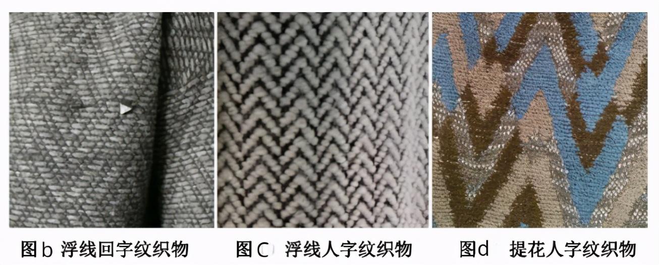 In picture c, a floating thread weave is used, but short floating threads are pulled out of white roving and black spun yarn is used as the bottom to make the floating thread part of the herringbone pattern more elegant. Highlighted, the fabric looks thick and dense, fully imitating the look of autumn and winter woven herringbone coat outer fabrics.