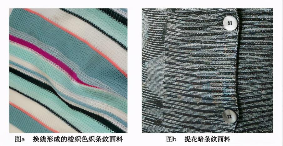 Variegated yarns are combined with less elastic metal wires, interspersed and matched with stripe patterns of the same color to form a woven fabric. Dark striped jacquard patterns are common in fabric design, the fabric is flat and dense, and the weaving style is stronger.