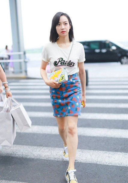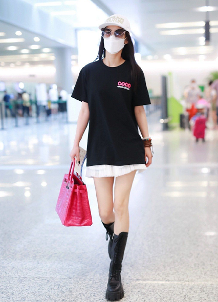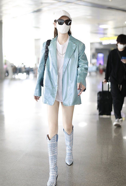 As a senior in the fashion industry, Qi Wei is very good at making T-shirts. Take this ordinary long white T-shirt as an example. After she matched it, she instantly had the temperament of a trendactress . Pair it directly with a shiny snake-print blazer and a pair of fresh personalized boots to complete a handsome outfit.