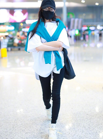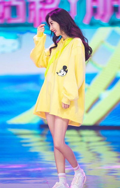 Now that we have mentioned this way of dressing, we must not miss Yang Mi, the king of our bottom-disappearing dressing method. A cute goose yellow hooded sweatshirt with a loose and open hem, giving it the feel of a cute skirt. It is paired with Mickey embroidery to make the look more youthful.