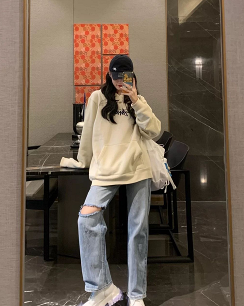 If you don’t like the too casual and sporty look, you can consider this kind of cool look. A milky white hooded sweatshirt, casual and cute, paired with a pair of simple wide-leg pants with ripped holes, casual and rebellious. The combination of the two is the kind of age-reducing casual fashion we want. feel.