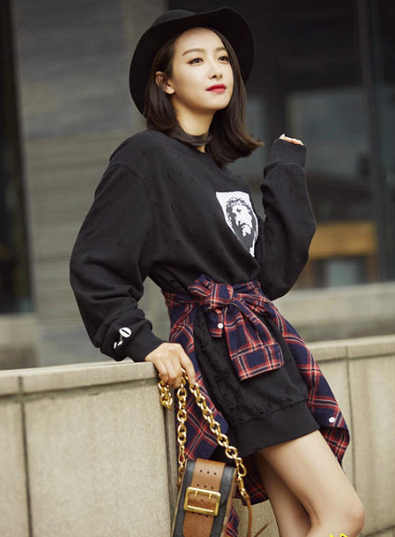 Take Song Qian as an example, the fashionable layering of this layered outfit is very prominent. A black sweatshirt with a slightly long hem, paired with a plaid shirt, worn directly at the waist, not only highlights the waist and waistline, but also transforms the sweatshirt into a fashionable skirt that highlights the sultry charm. , the dressing effect is perfect.