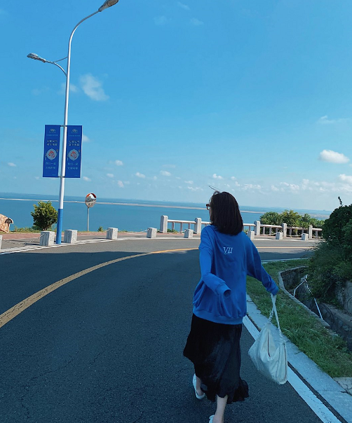 A simple blue sweatshirt with sky blue design makes people look very refreshing, and a white high-waisted pleated skirt , carrying the girlishness to the end.