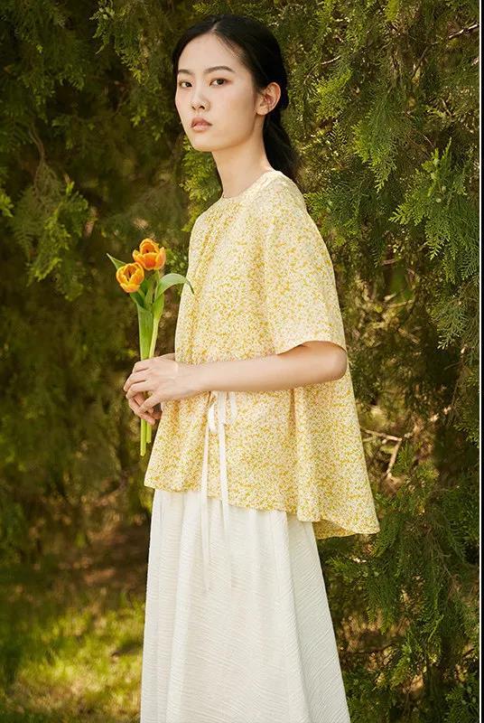This one-shoulder T-shirt is designed with a small yellow floral design. The fresh and soft charm is deeply rooted in people’s hearts. The T-shirt The version is relatively loose, easily highlighting the gentle and elegant charm. Moreover, the overall version is long in the back and short in the front. With the addition of a white belt, the tone echoes the skirt, and at the same time blends with the yellow to highlight thegentleness A sense of tranquility. No need for heavy makeup, a delicate face is enough to show a sense of luxury, and paired with a low ponytail hairstyle, it adds a bit of charm.