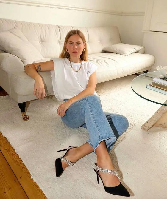 Jeans and a black belt give it a casual and retro vibe. The upper body is a pure white round neck T-shirt with shoulder pads. This combination makes the armpit lines very beautiful and can also highlight the slender and graceful figure. In the morning and evening, you can choose a soft knitted sweater to match it, which is pure, elegant and very casual. Pure black sunglasses add a cool vibe and are gentle yet domineering.