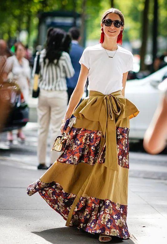 The floor-length skirt uses a combination of floral elements and solid colors. The overall tone is very warm, full of leisurely and feminine connotations. The bow at the waist is particularly eye-catching, and the extended lines add to the agility and style. This item itself has a very ethnic feel. The bright red tassel earrings echo the style of the lower body. Paired with a white shoulder-padded T-shirt, it adds a lot of softness and freshness. The gold mini clutch exudes a refined and high-end feel.