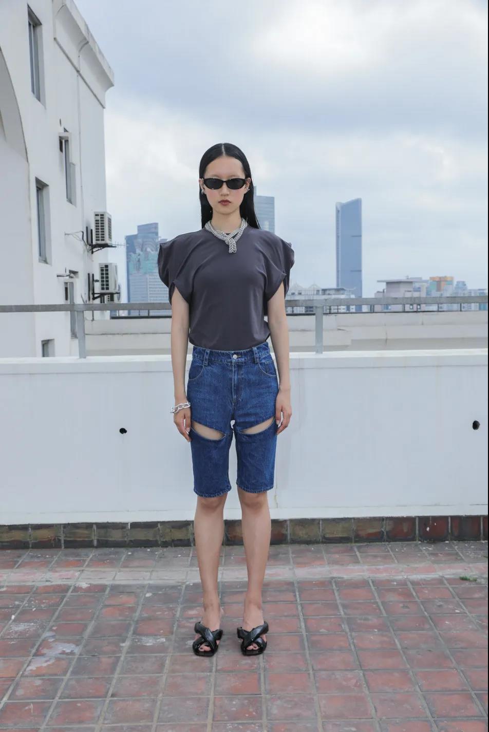 Denim shorts are a knee-length design Style, showing a casual atmosphere, but also sexy charm. The holes on both thighs are symmetrical, especially delicate and stylish. The upper body shoulder-padded T-shirt has a dark gray design style, which is elegant and simple, and contains a strong sense of cool and high-end style. Wear cat-eye sunglasses, and your aura is quite strong. The iron chain bracelet echoes the bracelet, and the whole set is very chic.