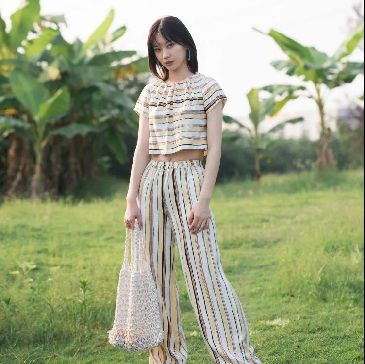 The neckline design of this shoulder-padded T-shirt is very distinctive, and the elastic pleated elements are gentle, casual, and very low-key. The striped design is full of gentle style, and the several tones in this outfit are all elegant and fresh. The lower body casual pants and shoulder-padded T-shirt form a complete set, which is simple, low-key and rustic. The handbag is designed in a light pink fishnet style, full of elegance, tranquility and romance.