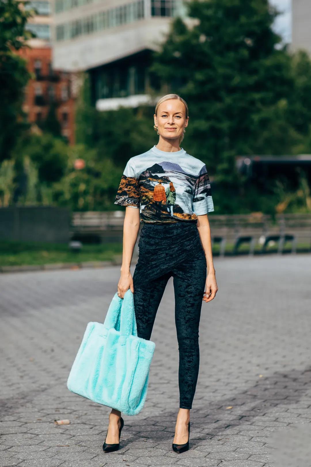 The tights are a pair of black and dark green A fusion design, retro style and charming and sexy style are cleverly blended. Pair it with pointed high heels to highlight the sexy look of your feet, and the combination of the two items is very cool. The handbag has a mint green design style, which is refreshing, beautiful and atmospheric. The print on the shoulder-padded T-shirt suddenly incorporates a romantic style and can highlight the artistic charm of personality.