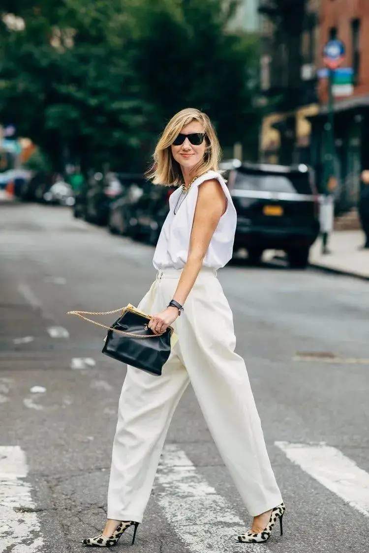 Although the color of the milky white cigarette pants is very gentle and soft, the style of these pants is full of domineering feeling. Choose leopard print high heels to combine with it to exude a cool and charming style. The shoulder-padded T-shirt on the upper body is a pure white design style, and the overall color combination is very elegant and soft. The black leather handbag is elegant and sophisticated, and the metal chain echoes the necklace. Wearing sunglasses and walking on the street, you are the coolest and most domineering girl!