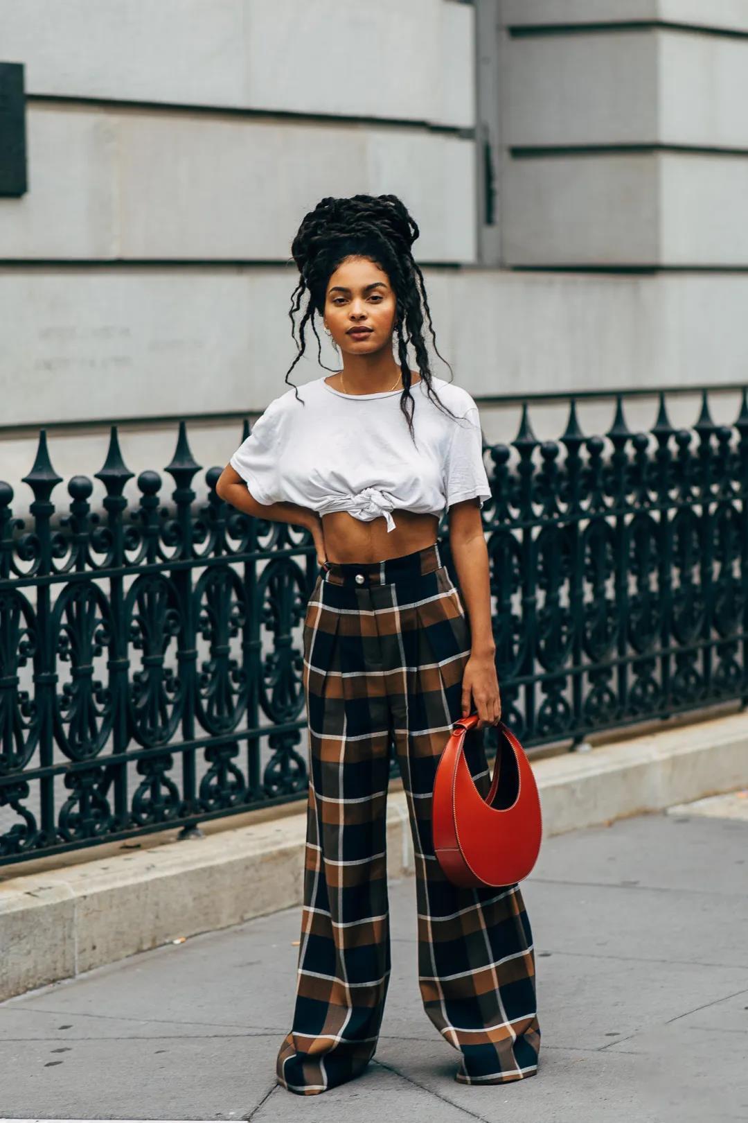 Low-waisted floor-length trousers are a very slimming and taller item. The brown and brown large checkered designs give this deep classic atmosphere. The bright white lines can add a neat and free style. The shoulder-padded T-shirt is A sexy midriff-baring design, feminine, dignified and quite stylish. The buckle is full of romantic art, and paired with a semen-absorbing big red handbag, it is full of sassy personality. The towering braided hairstyle Do you dare to try it?
