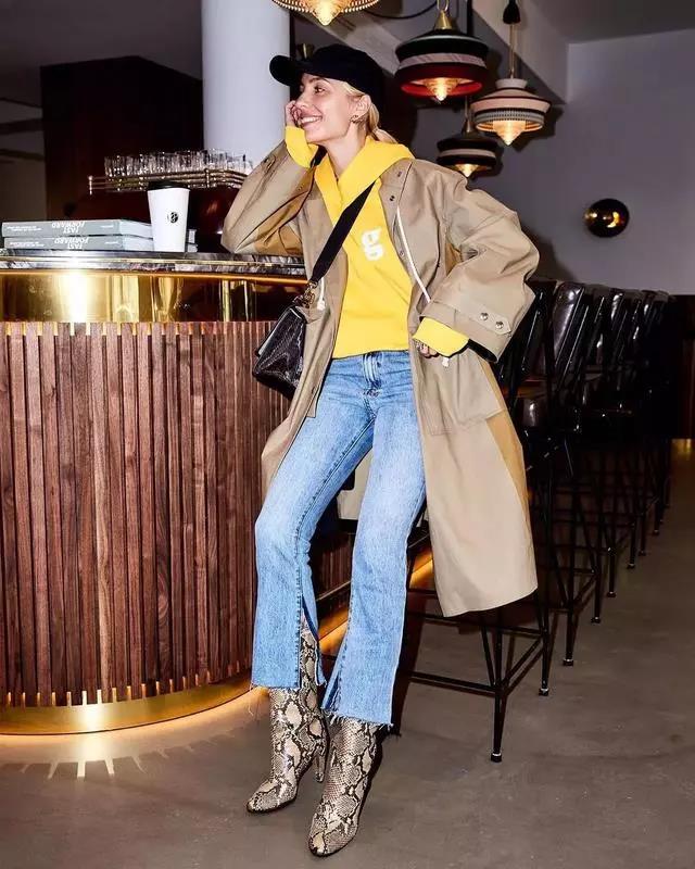 Bright-colored sweatshirts are full of youthfulness and have a bit of flamboyance, making the upper body look fashionable and stylish. Pair the upper body with a light-colored washed windbreaker, which looks fashionable and simple, but also visually outstanding. For the lower body, choose high-heeled short boots to help extend your height. This way of dressing is also very suitable for petite girls.