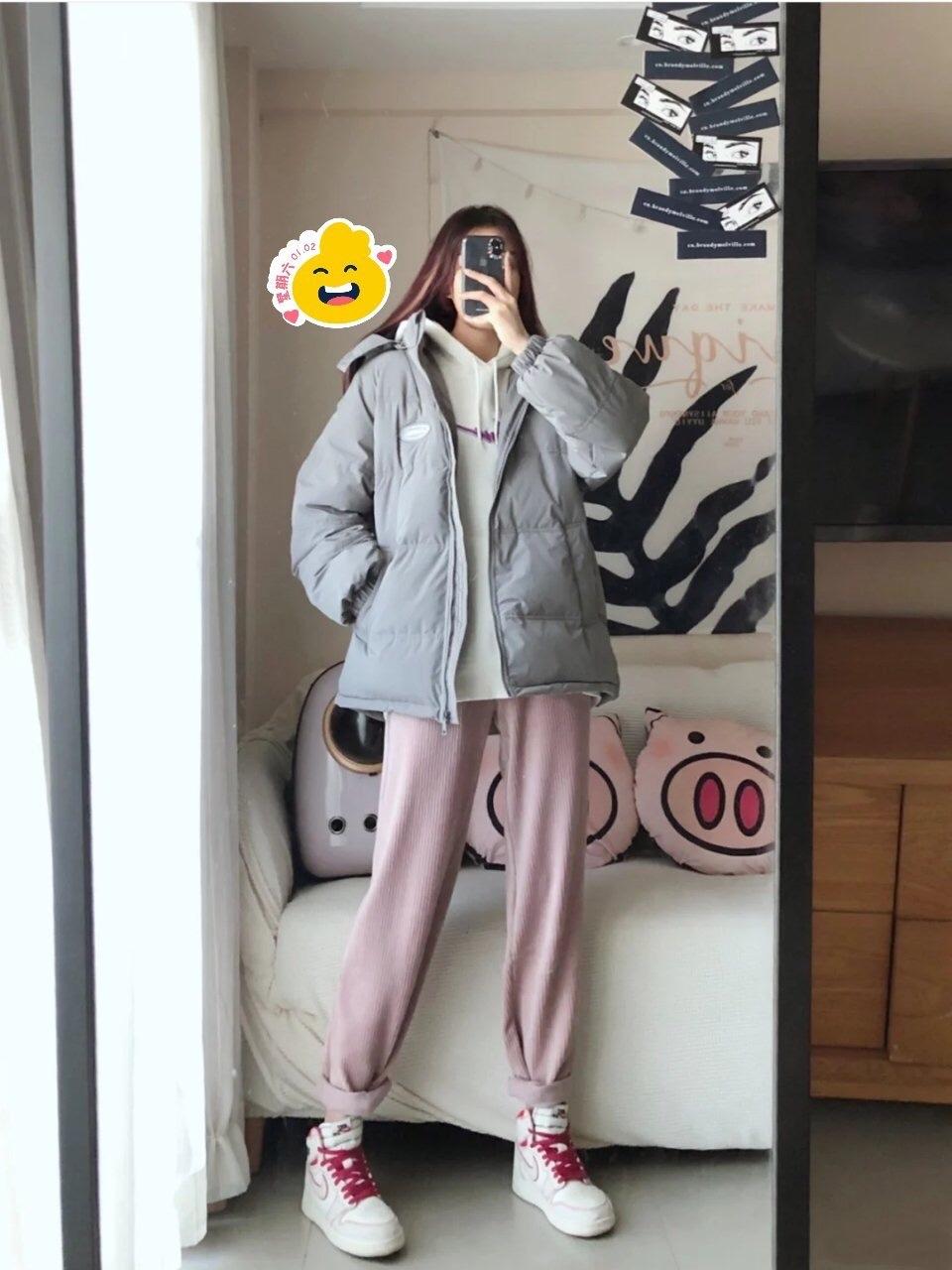 Look1: White hooded sweatshirt + gray down jacket + pink casual pants