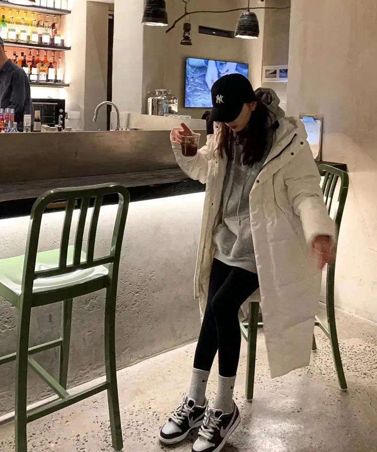 The gray loose hooded sweatshirt just reaches the length of the thigh, making the whole leg look more slender. For the lower body, I choose shark pants, which are very popular this year, with a tight top and bottom fit. It is super suitable for sisters with pear-shaped figures. At the same time, all the attraction is concentrated on the lower body, making them full of youthful vitality. At this time, use a white long down jacket to decorate the overall look, which is fashionable and aura.