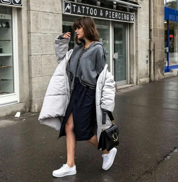 A very important point when matching down jackets with sweatshirts is that they need to have a sense of layering strong>. Maybe people used to think that small hoops and big hoops were an ugly way to wear, but you can make such a choice when pairing it with a down jacket.