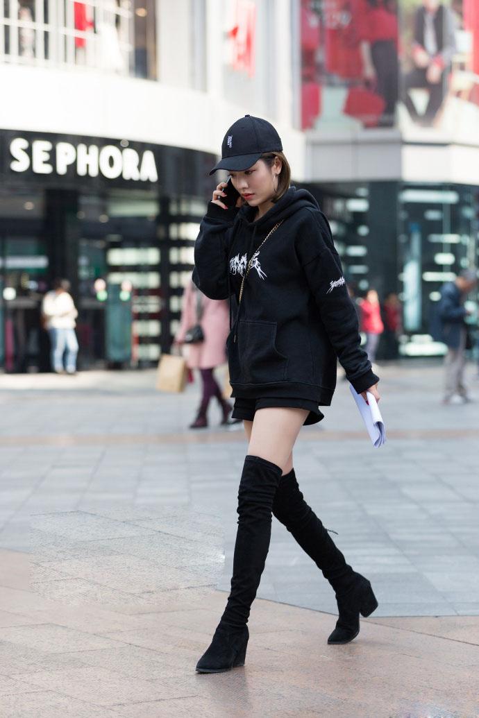 Look2: Black hooded sweatshirt + shorts + high boots style