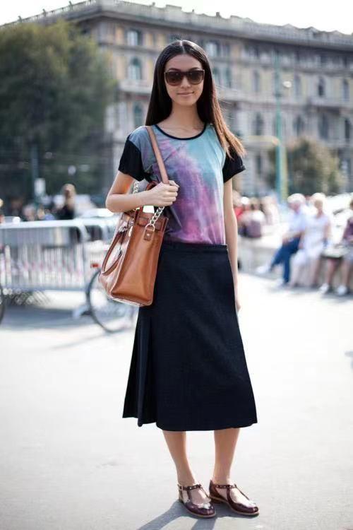 There is no obvious waistline ratio in the same color series. In addition to using a belt to modify it, we have to rely on the charm of the item itself. Different The fabric will have a certain impact on the proportion of the overall body shape. In addition, if the color of the skirt is monotonous, we can choose a patterned T-shirt to have a clear dividing line with the skirt.