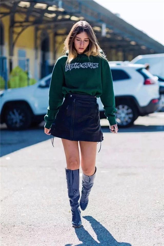 The fashion sense is more prominent, especially when paired with leather shorts and black leather shoes, the most beautiful part in the middle is exposed, and the upper body is paired with a dark green printed sweater, which is fashionable Strong and sexy.