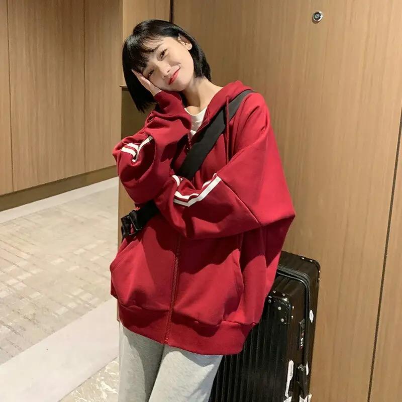 A cardigan-style sweatshirt looks particularly handsome when worn as a jacket, especially the red sweatshirt, which will give people a refreshing feeling and make it more comfortable. Lively and more suitable for younger student parties. The lower body is matched with gray wide-leg pants, which makes the outfit full of vitality and the overall look is comfortable and youthful.