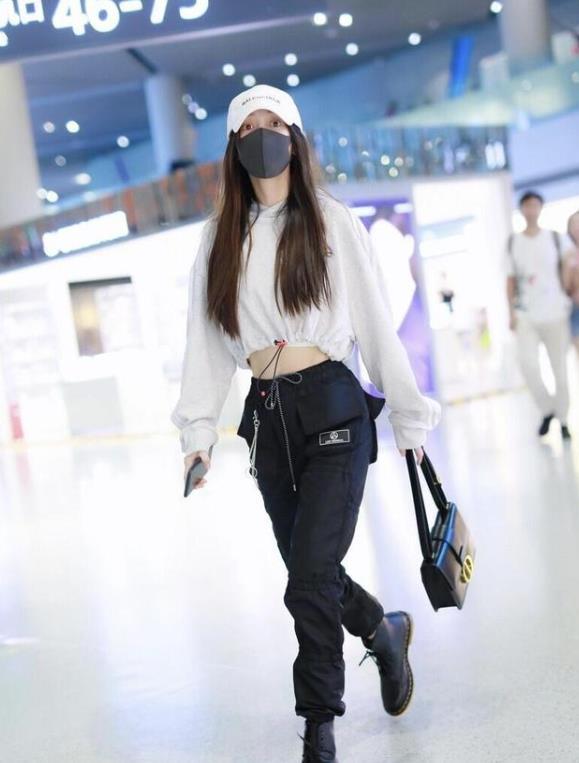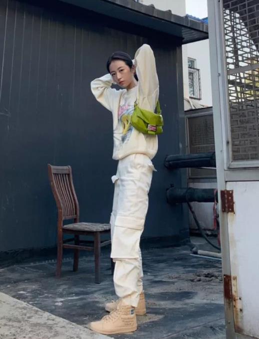 Needless to say, the versatility of the black cross-body bag, the white sweatshirt with fashionable patterns is simple and fresh, but also reveals the visual aspect A sense of fullness. Black work trousers with a metal zipper design, comfortable and convenient to open and close, and the trousers cuffs are slightly rolled up, making them look neat and capable.