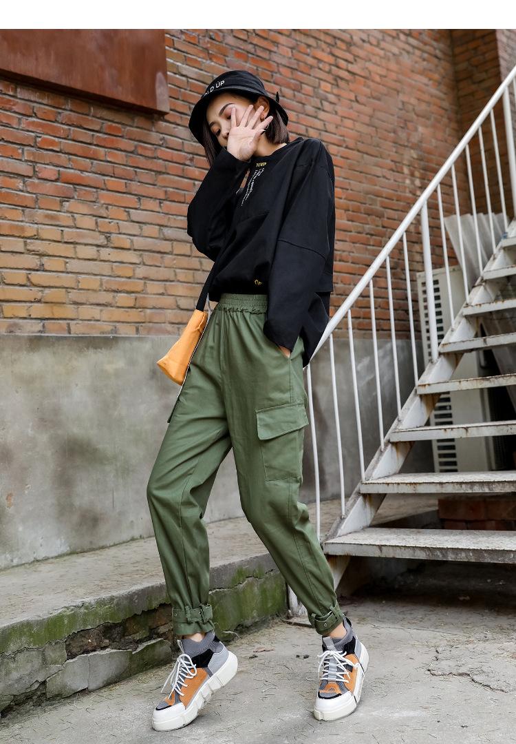 Military green workwear casual trousers, the cut with a drawstring to create a neat and capable look, paired with black short boots for a casual and chic look, making the whole look handsome. , the feeling of being cool and sassy also arises spontaneously.