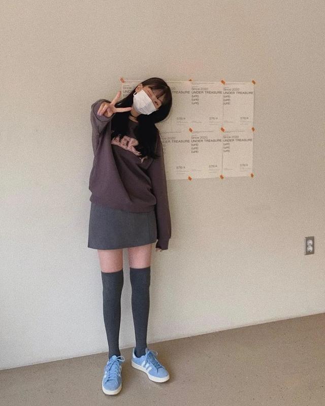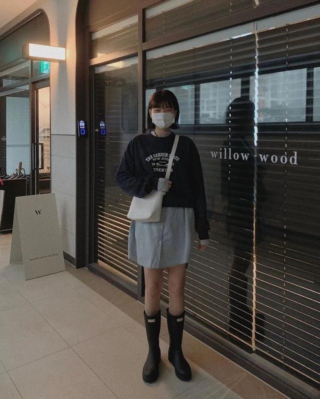 深蓝色的卫衣带有字母的印花,圆领看上去更加的简洁,高级下半身则是搭配了短裙和高腰的靴子,形成了非常时尚的一种感觉。这种搭配方式在早秋是非常流行的,能够分分钟变成时髦精。