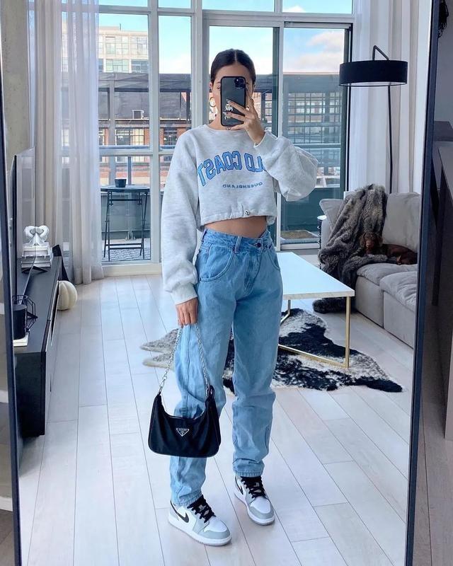 最为简约的就是圆领的灰色卫衣,有着初秋的高级感,下半身则是搭配了高腰的老爹裤,灰蓝之间的配合很高级,颜色上就占有一定的优势。在日常搭配时,这两种颜色的融合配合程度也比较高,简约的基础款式,露出一部分的纤细腰围,看上去很好的比例。