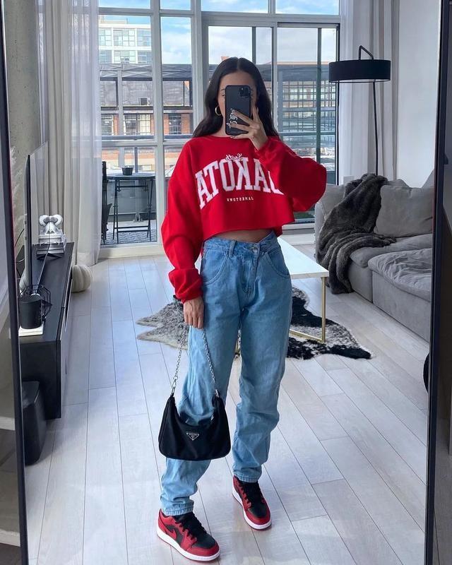 红色已经不是专属于季节的一种颜色,在日常生活中也可以选择红色的卫衣进行搭配,同样是高腰版型的牛仔裤,用红色的鞋子进行配合,这是最为常见的一种搭配方式,简约即高级,将为卫衣出了时尚运动范儿。