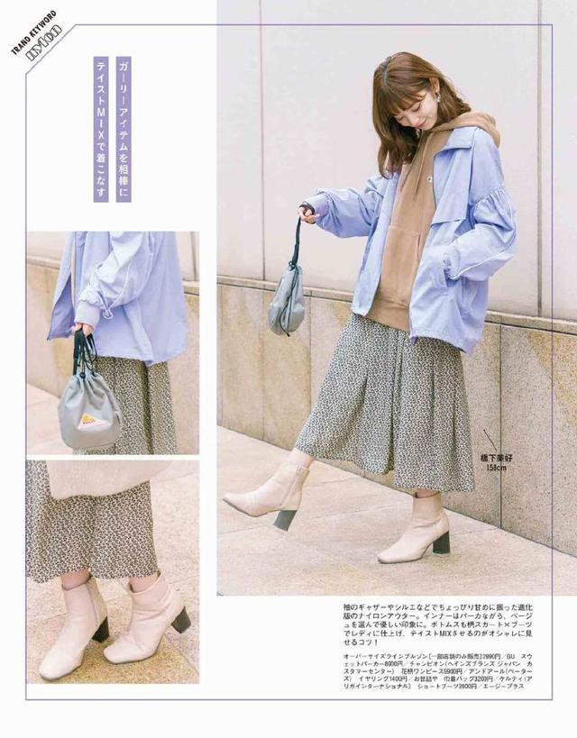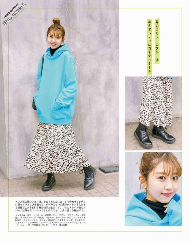 比如这种简约的卫衣和裙子之间的搭配,选择了碎花开叉的连衣裙,黑白色的碎花裙很好搭配,上半身则是叠穿了一件纯蓝色的卫衣,露出一部分的花边儿,形成了年轻的视觉感,彩色系饱和度并不高,看上去很高级。