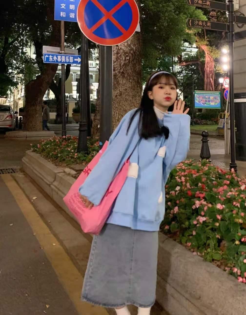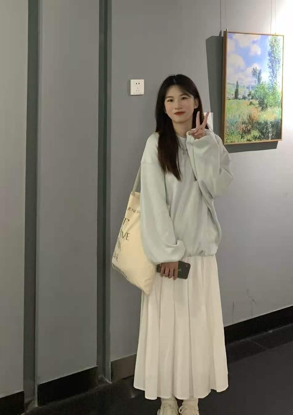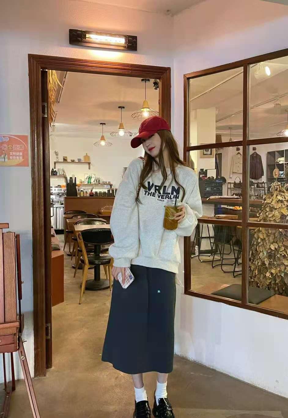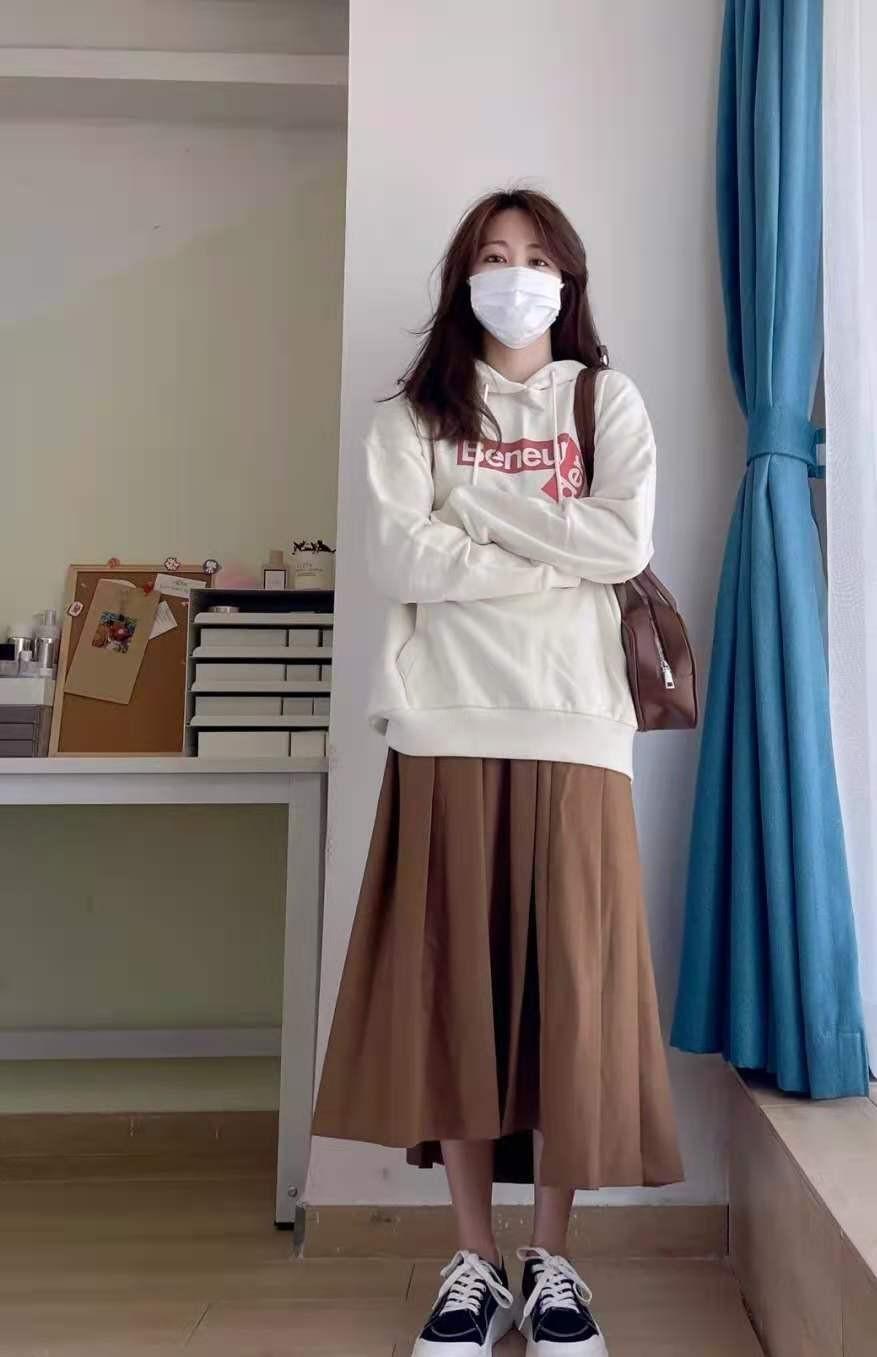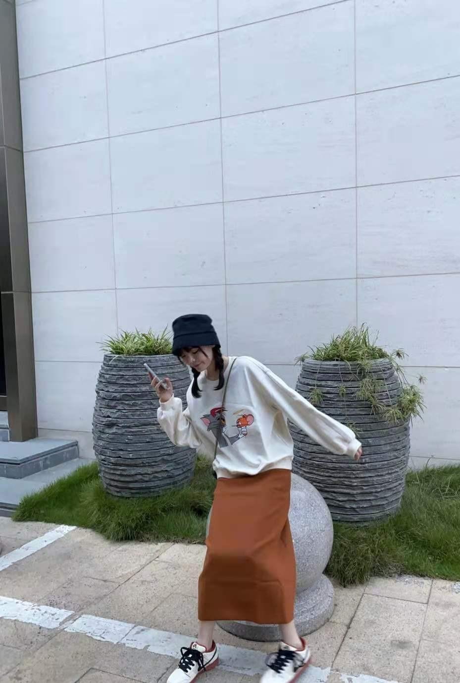 Sweatshirts and knee-length skirts are both items in the autumn clothing series. They are highly photographed in daily life and can be captured on the streets basically every day. See the figures of both. However, most people wear them separately, and few people wear a sweatshirt and a knee-length skirt together. You might as well give it a try to ensure that you can unlock a different fashion charm.