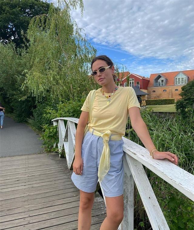 The creamy yellow T-shirt uses a unique knotting method to form the world’s most popular T-shirt. This light creamy yellow is this year’s popular color and can bring out the overall appearance of the person. It is particularly eye-catching. It is paired with a pair of blue shorts, which are just above the knees.