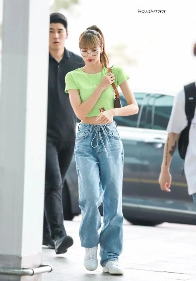 Blue jeans are a common figure in summer, and green T-shirts are also a member of the candy color family. This combination of blue and green is just right, giving people a It has the feeling of a energetic girl, especially in the summer when the small waist is exposed, which completely gives people inspiration for dressing, revealing the skin and being high-end.